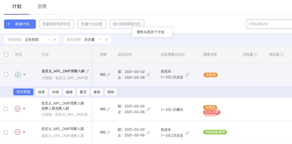 在推广计划建立初期,由于计划的数据量过少,系统预估存在困难,导致您的计划前期拿量速度较缓。该冷启动期不同的计划表现不一致,少则1~2天,多则3~6天,甚至部分计划需要10天。因此平台推出了冷确定优化功能,帮助您的计划快速度过冷启动期。
