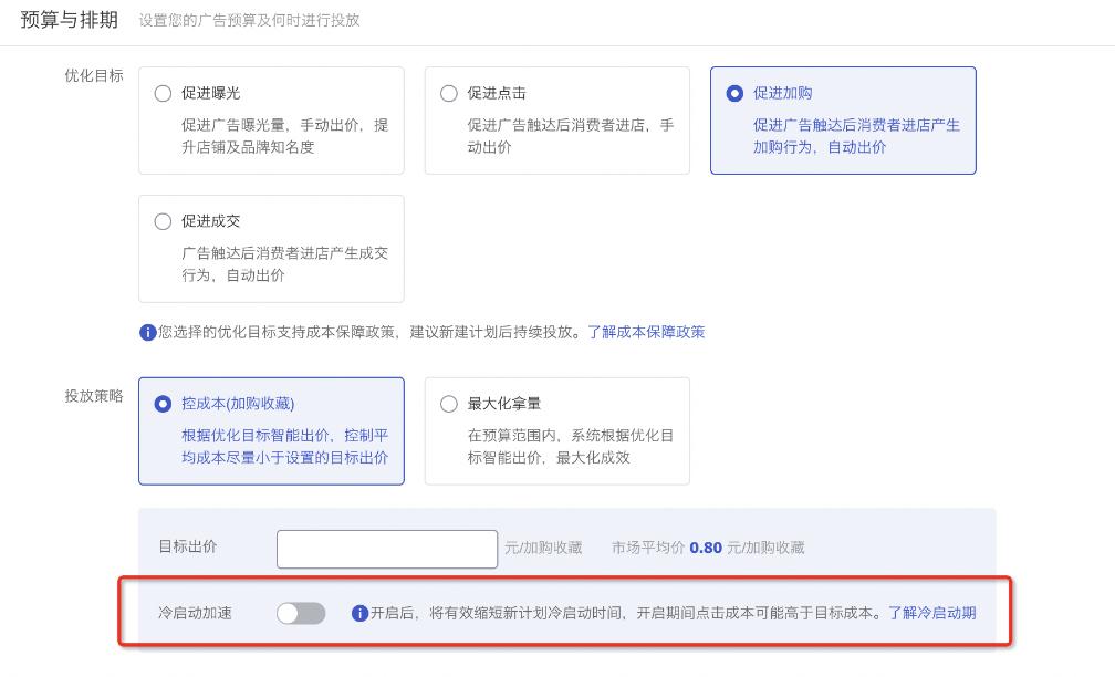 当您的投放计划选择为【促进点击】、【促进加购】或者【促进成交】,即选择自动出价方式时,在【目标出价】下方将出现【冷启动加速】按钮,点击打开即可。
